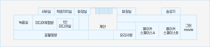 미디어체험방, 학생자치실, 꿈활동방, 요리사방, 메이커스페이스A, 메이커스페이스B, 그린movie
